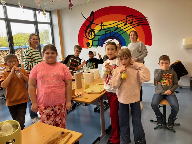 Zusammen mit Frau Dillenburg und Frau Poss bereiten die Kinder in der AG "Tischlein deck' dich" leckere und gesunde Säfte zu.